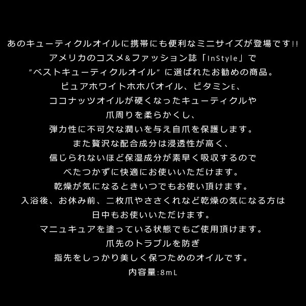 内容量:8mL成分:ホホバ種子油、ヤシ油、ミネラルオイル、 酢酸トコフェノール(ビタミンE)、香料、紫201使用方法 キューティクル(爪の付け根周辺)部分にハケで適量を塗り擦り込むように優しく爪と甘皮を マッサージするようにのばします。